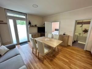 Apartament składa się z osobnej sypialni wyposażonej w dwa łóżka oraz salonu z sofą i telewizorem z płaskim ekranem. W pełni wyposażona kuchnia zawiera płytę grzewczą, lodówkę, zmywarkę, ekspres do kawy, toster, czajnik elektryczny oraz niezbędne naczynia kuchenne. Łazienka dysponuje wanną oraz bezpłatnymi kosmetykami i mydłem, do dyspozycji gości jest także suszarka do włosów. Dodatkowe umeblowanie obejmuje szafę oraz ogrzewanie w części wypoczynkowej.