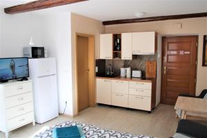 The apartment includes one bedroom furnished with non-feather pillows, slippers, and bed linen. Guests can prepare meals in the fully equipped kitchen featuring a stovetop, microwave, refrigerator, kitchenware, and a tea and coffee maker. The living area provides seating and entertainment with a flat-screen TV. The bathroom contains a shower along with complimentary toiletries and a hairdryer. Additional conveniences include a washing machine and heating controls to adjust comfort levels.